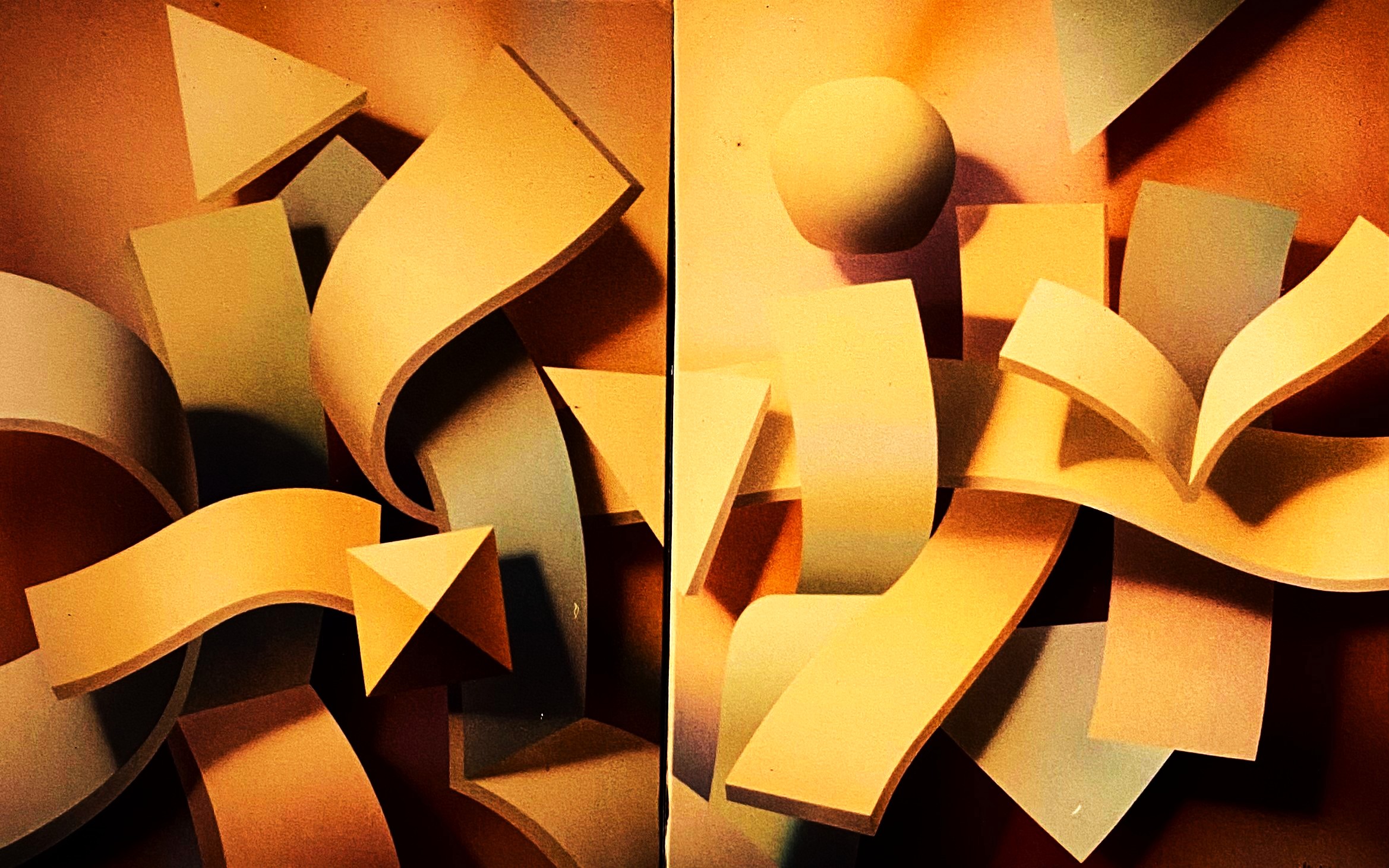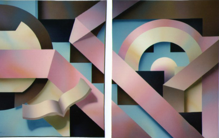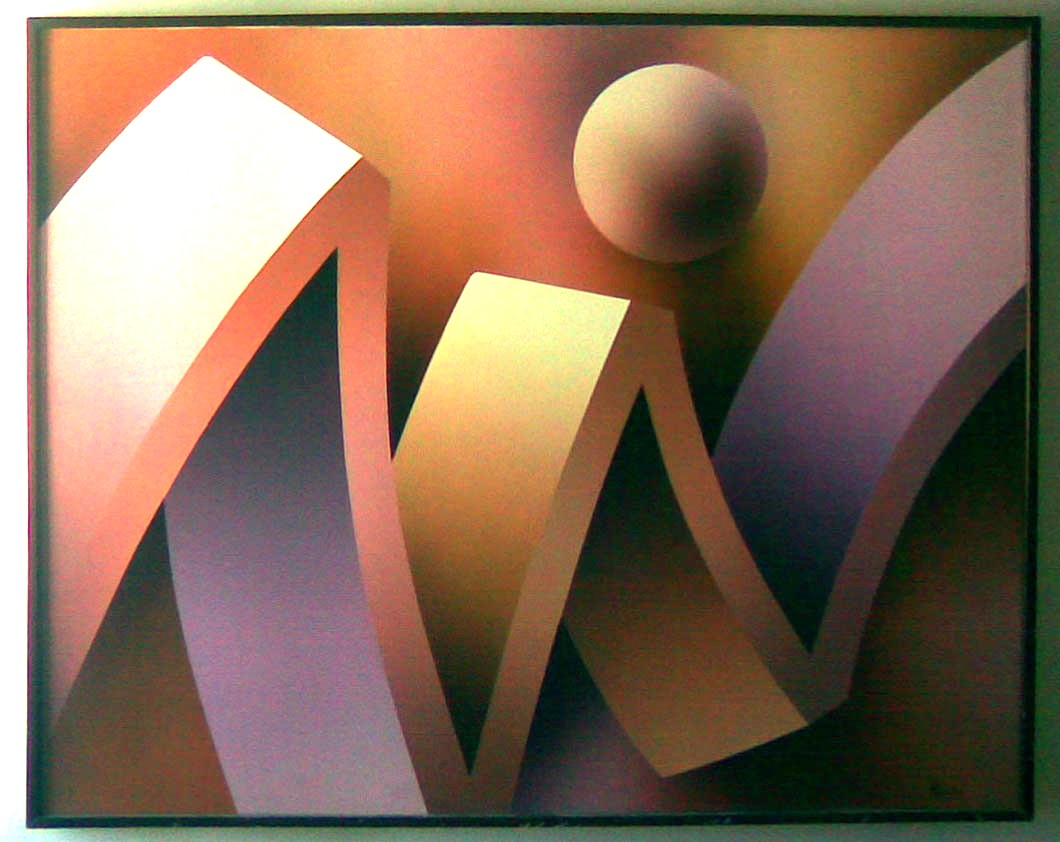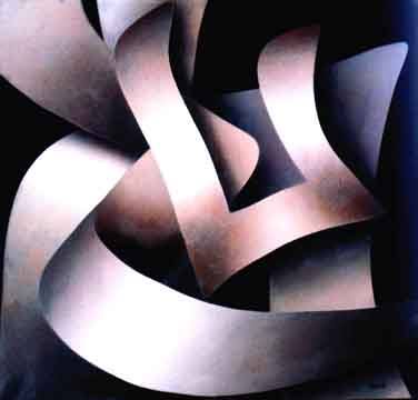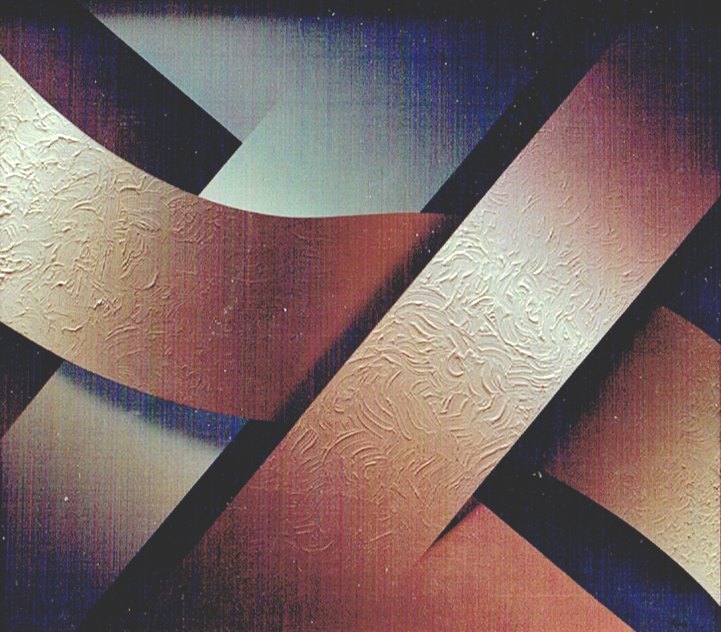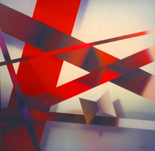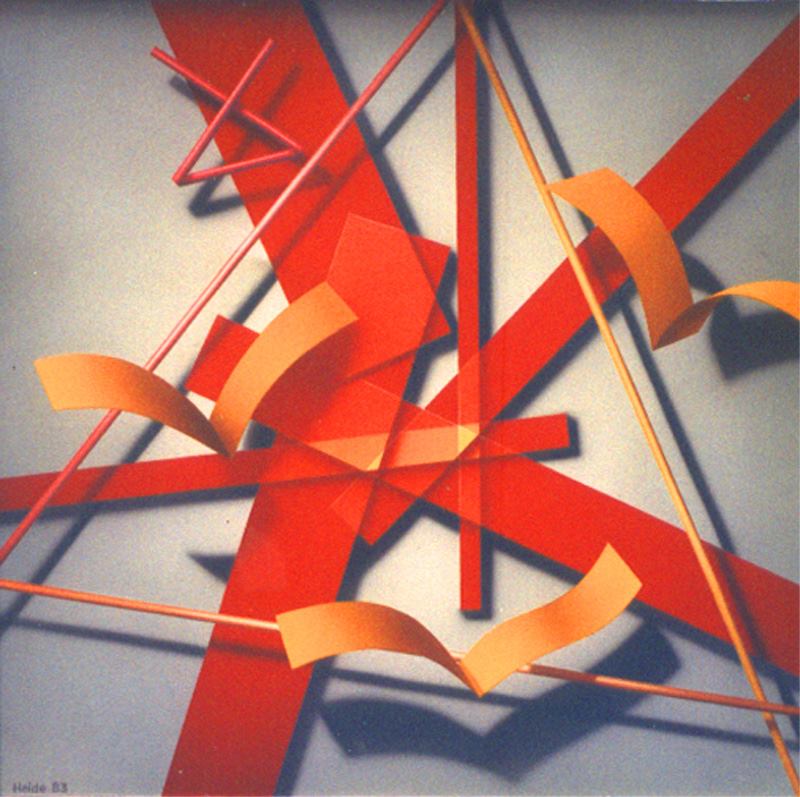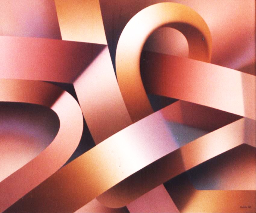 Cintas geométricas y barras. Ortogonales y diagonales que se cruzan en un espacio aparentemente tridimensional. Año 1980 (aprox.)