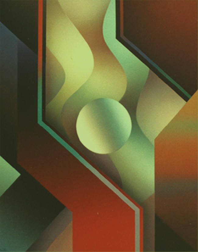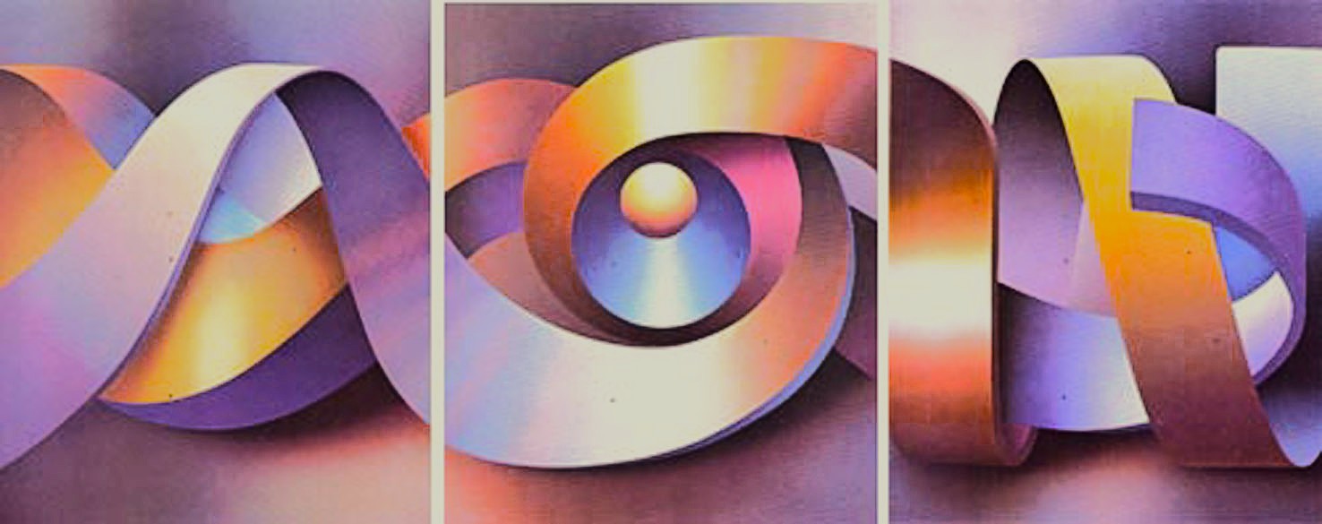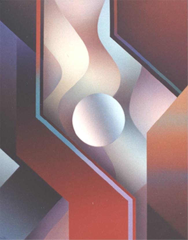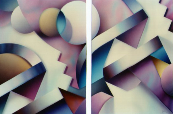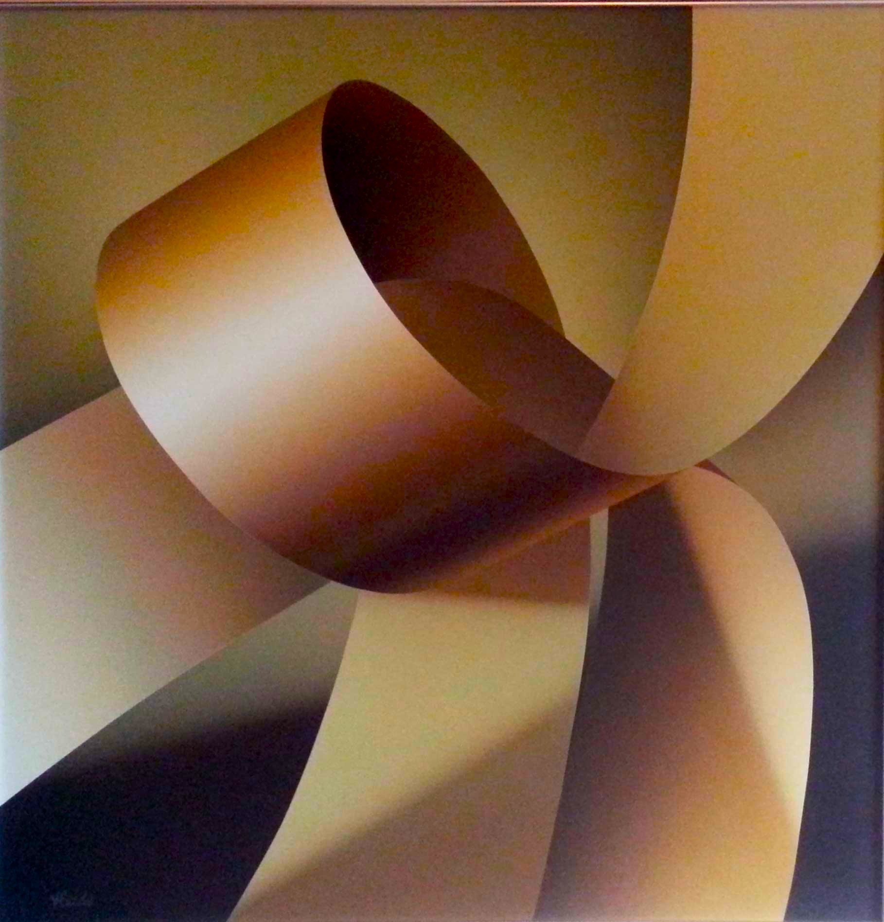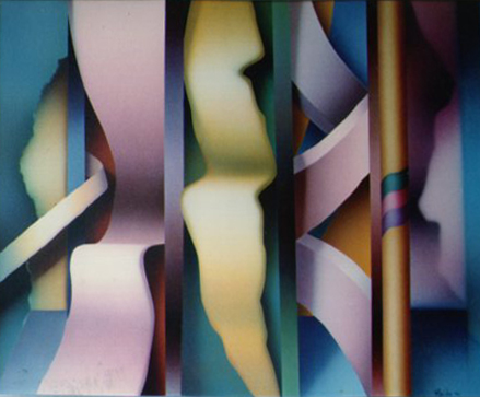 Cintas geométricas y barras. Ortogonales y diagonales que se cruzan en un espacio aparentemente tridimensional. Año 1980 (aprox.)